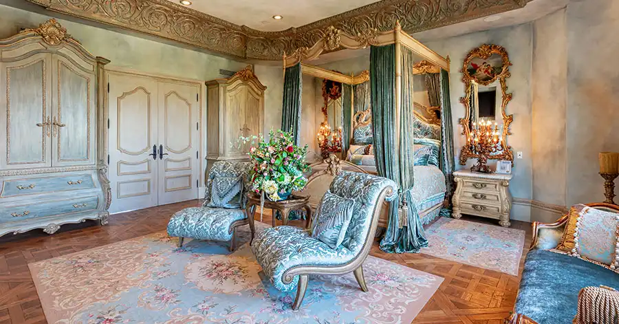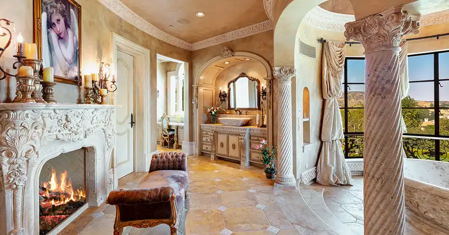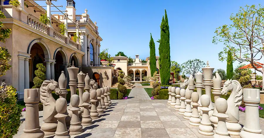 Landscape artist James Dean, designer of the grounds at the Ronald Reagan Presidential Library and Museum, created the home’s baroque, formal French gardens. It features an infinity-edge pool with Bellagio-type arcing water “spitters,” and an above-ground spa enjoys fabulous views of the San Fernando Valley. Don’t forget the a huge Travertine chess board with stone-like chessmen.