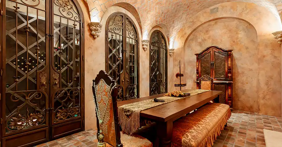 Classic groin-vault ceilings throughout, Palladian windows that bring the outdoors in, and 20-foot steel-and-glass rear doors are just a few of the designer touches in this showcase home. Plenty of reasons to stay at home include a library, theater, exercise and massage rooms, and a wine cellar that can hold about 5,000 bottles behind three sets of glass French doors.
